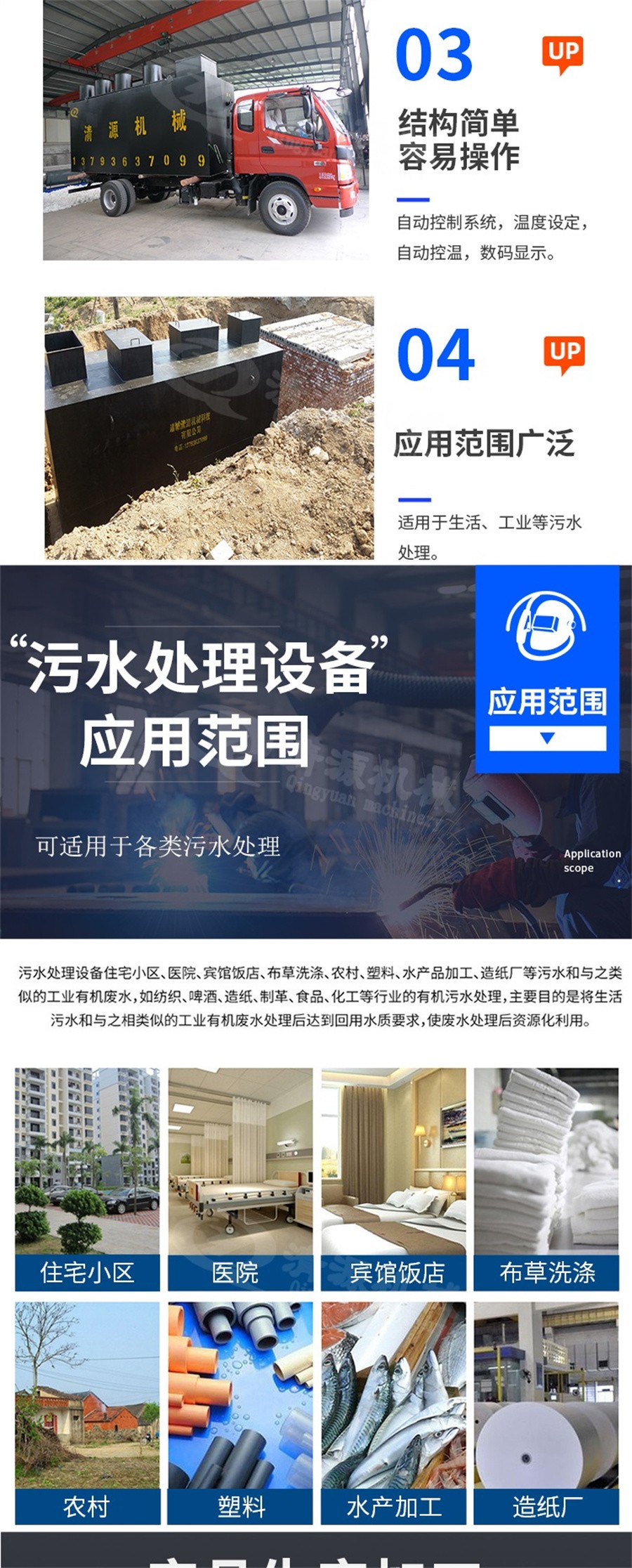 能夠處理生活系統綜合性廢水及其相類似的有機污水;采用玻璃鋼、不銹鋼結構,具有耐腐蝕、抗老化等優良特性,使用壽命長達 50 年以上 全套裝置施工簡單、操作容易,所有機械設備均為自動化控制,全部裝置可設置于地表以下,占地面積小。
