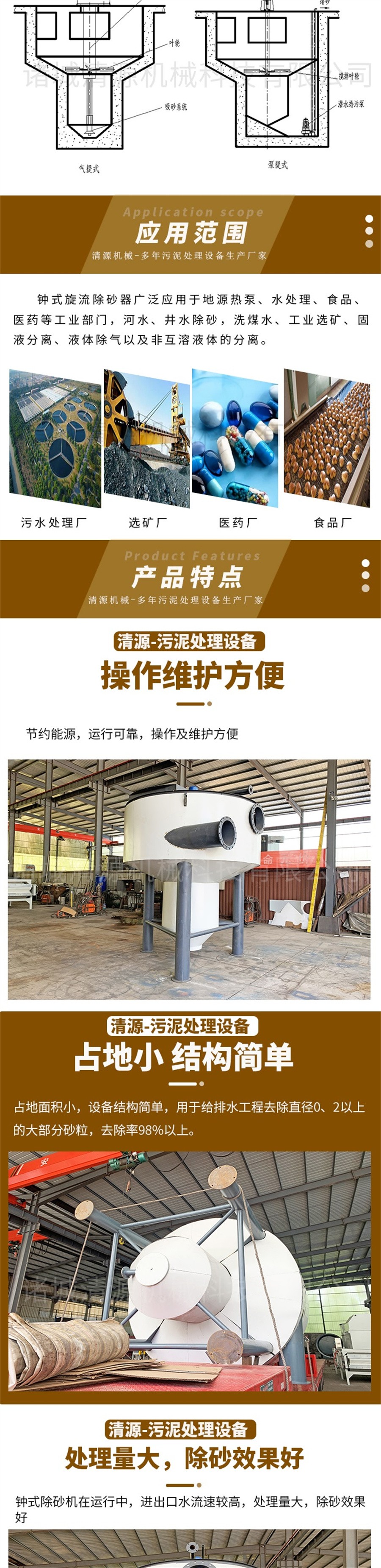 鐘式旋流除砂機系統在運行中,進出口水流速較高,處理量大,出砂效果好,占地面積小,設備結構簡單,節約能源,運行可靠,操作及維護方便,適合大中小型污水處理廠使用。