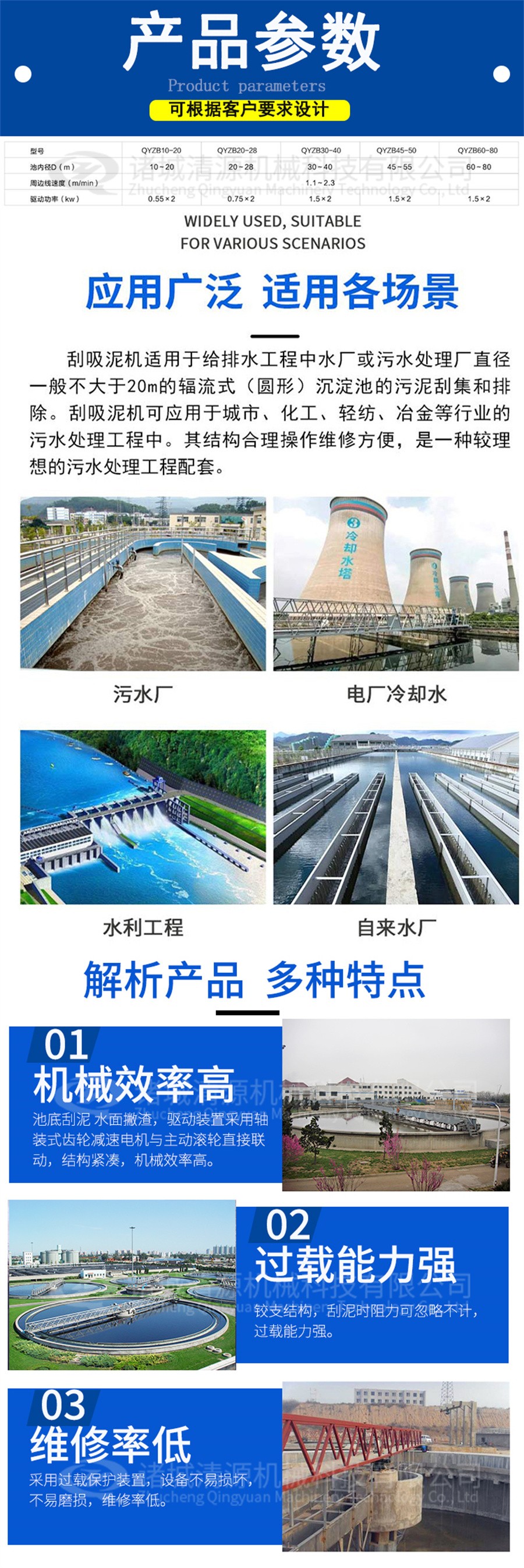 全橋式周邊傳動刮吸泥機用于污水處理廠、自來水廠以及工業廢水處理中輻流式沉淀池。將沉降在池底的污泥刮集到池底的集泥坑,池面的浮渣被撇向管式排渣斗。