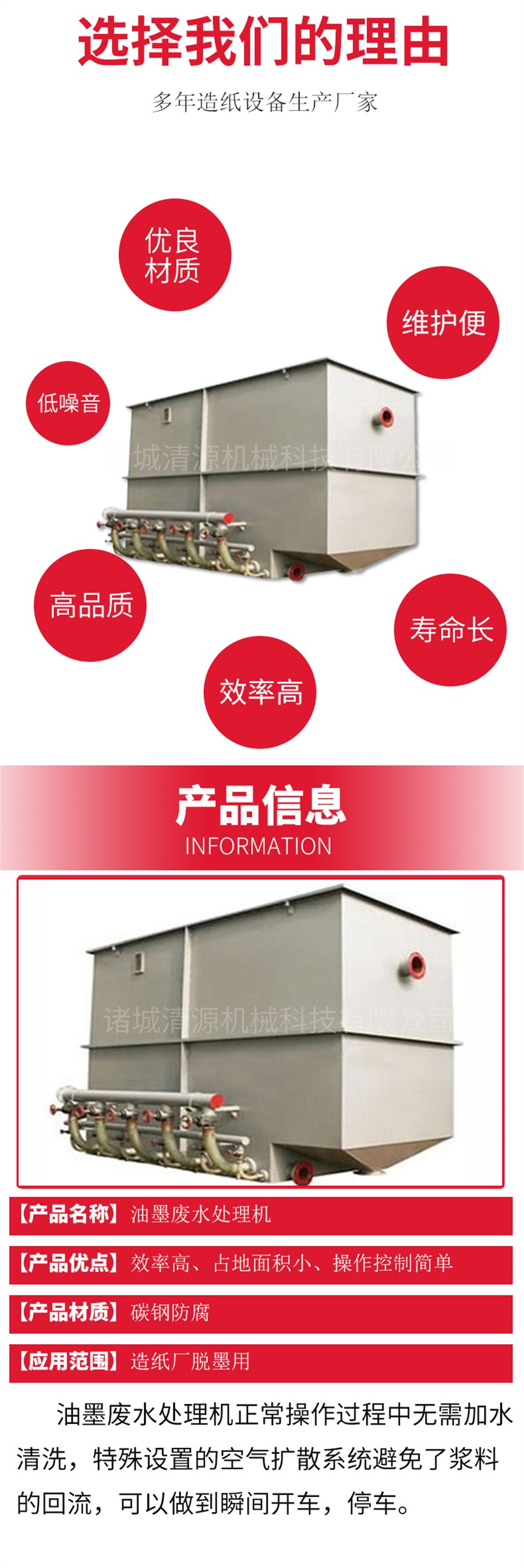 油墨廢水處理機用途:該設備在浮選ONP/OMG或MOW等廢紙漿時其脫墨效率高達98%以上,甚至不加化學藥品也能達到這樣的脫墨效果。這種浮選機空氣有多層多段布置,漿與空氣的混合通過設置在浮選區的特殊空氣擴散器進行。紙漿經過多層多段空氣----漿混合段的處理、浮選區內裝有反應區以控制空氣泡的上移赫爾紙漿的上下移動,從而能達到極限浮選的效果。這種浮選形式及方式對脫墨至關重要,可以除去其他形式浮選槽難以除去的激光印刷油墨和紫外光固的油墨。
