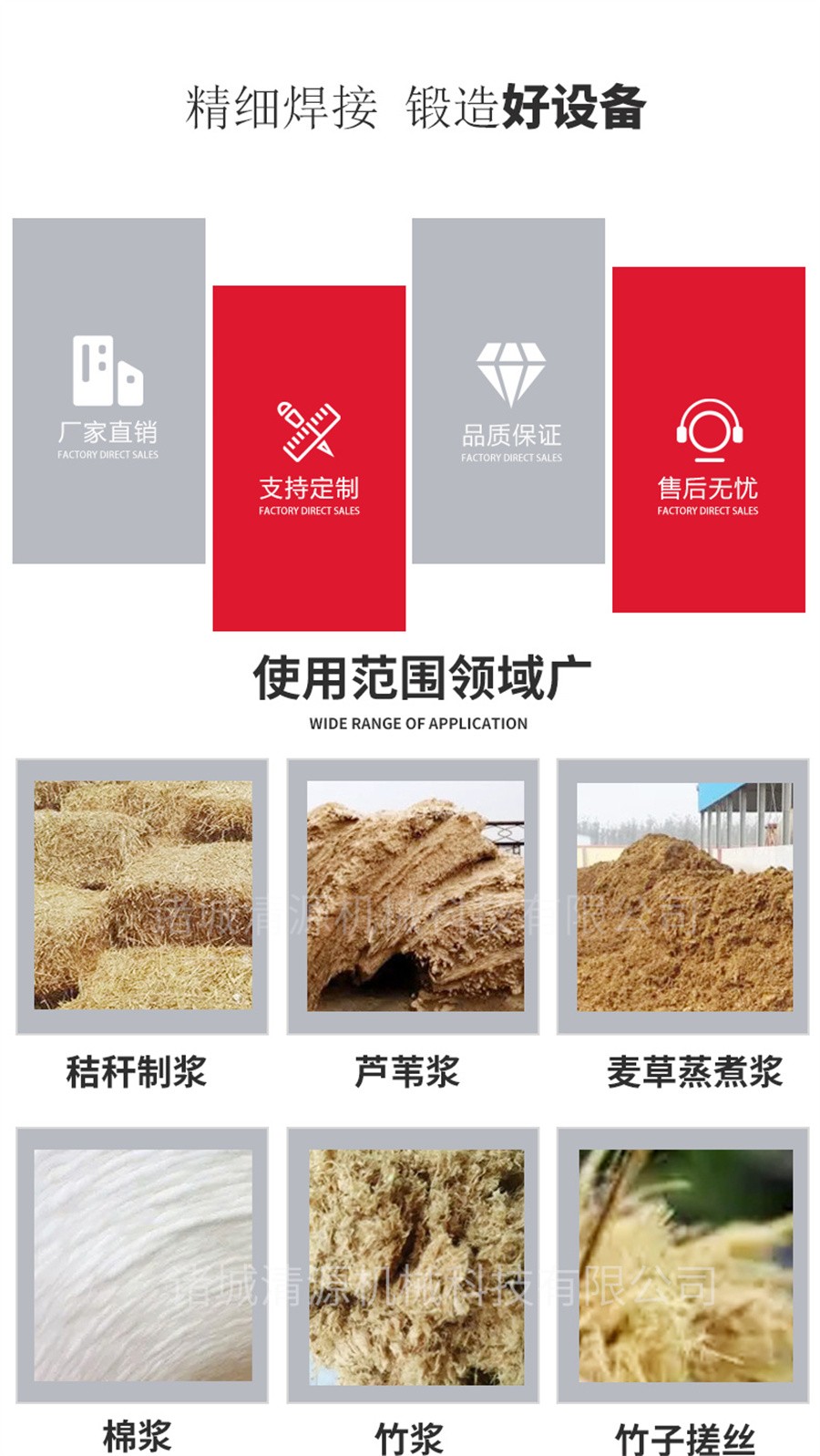 諸城清源機械科技有限公司生產的螺旋蒸煮器用以蒸煮造紙原料(如木材、草類、破布等),使與蒸煮液起化學作用而得到主要為纖維素的紙漿。