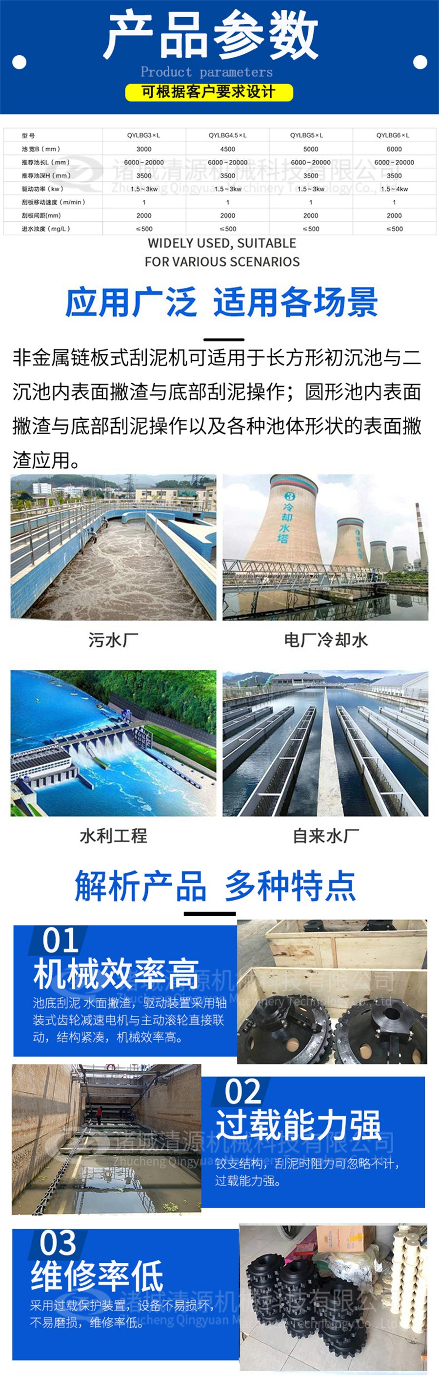 非金屬鏈條式刮泥機的概述:非金屬鏈條式刮泥機,是一種刮泥設備,可適用于長方形初沉池與二沉池內(nèi)表面撇渣與底部刮泥操作。