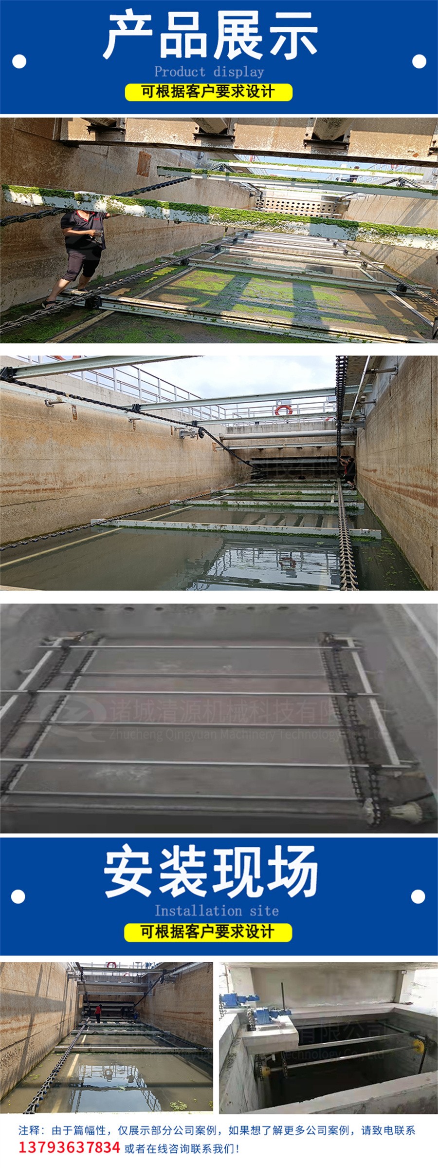 可適用于長方形初沉池與二沉池內(nèi)表面撇渣與底部刮泥操作;圓形池內(nèi)表面撇渣與底部刮泥操作以及各種池體形狀的表面撇渣應用。